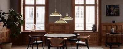 1965 was originally designed in 1948 for Finland House in New York like so many other works by the Finnish designer. The pendant is an example of Tynell's excellent ability to create light and elegant brass creations, and bears the triangular perforation pattern that Tynell often used in his lighting objects. It features a frosted glass diffuser that softens the light and creates a subtle and calm atmosphere. The pendant is available in brass as well as white, black and Chianti red - and even in a variant where it hangs with a counterweight that makes it easy to change the hanging height.