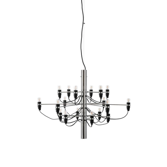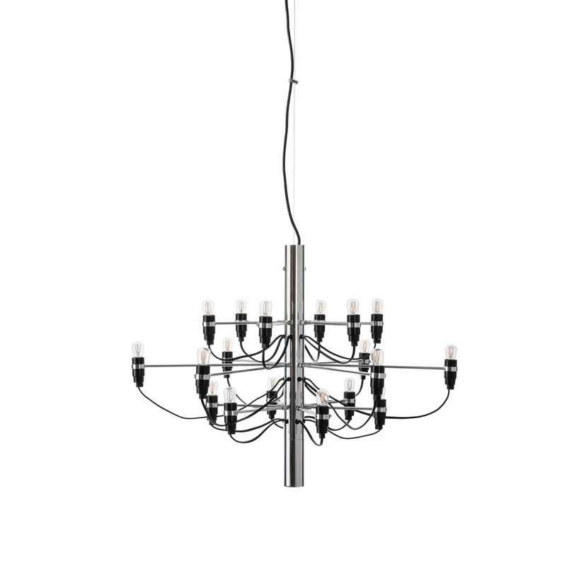 The lamp was designed by Gino Sarfatti in 1958, and it has become a design classic. Since its inception, it has served as inspiration for various other chandeliers, which is a huge compliment to the Italian designer., and see the chandelier with 18, 30, or 50 light sources.