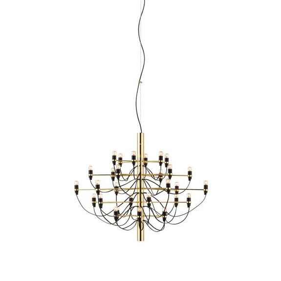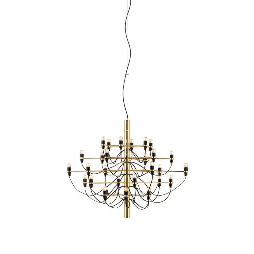 The lamp was designed by Gino Sarfatti in 1958, and it has become a design classic. Since its inception, it has served as inspiration for various other chandeliers, which is a huge compliment to the Italian designer., and see the chandelier with 18, 30, or 50 light sources.