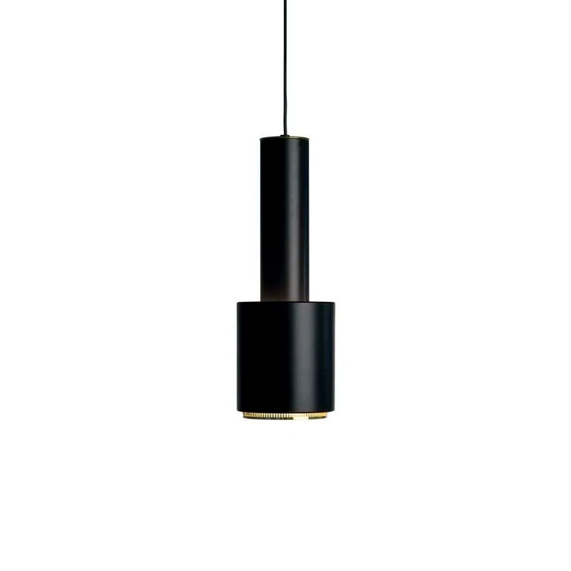 A110 Hand Grenade Pendant Black/Brass is named Hand Grenade after its distinct shape. The lamp was designed by architect Alvar Aalto, who originally designed it for one of his own buildings. The simple design is constructed using cylindrical shapes, giving it a minimalist expression with a retro touch—a simple and thought-through design that continues to be popular in modern interior design.