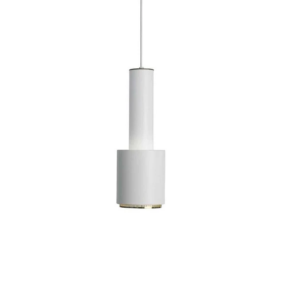 A110 Hand Grenade Pendant White/Brass is named Hand Grenade after its distinct shape. The lamp was designed by architect Alvar Aalto, who originally designed it for one of his own buildings. The simple design is constructed using cylindrical shapes, giving it a minimalist expression with a retro touch—a simple and thought-through design that continues to be popular in modern interior design.