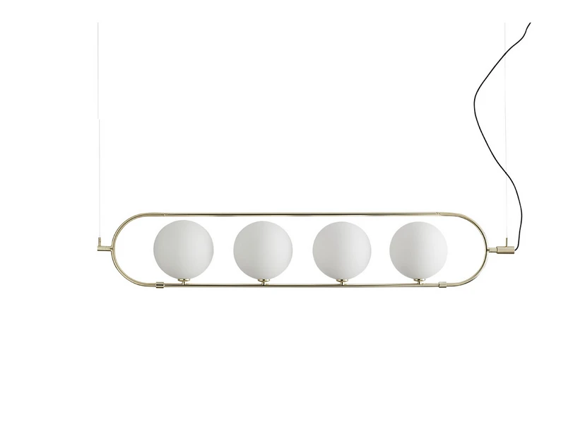 Abbacus Pendant lamp Light Gold is a beautiful lighting collection created by lighting designer Pepe Fornas for Spanish brand Aromas del Campo in 2018. The collection consists of pendant lamp lights, floor, table and wall lights in several beautiful colours, all with the same consistent design. The lamp has a soft design language due to the many arches and curves on the frame and the beautiful, spherical lampshade in opal glass. The frame beautifully frames the lampshade, making it the visual centre of the lamp. This effect is emphasised when the lamp is switched on, and the lampshade lights up in a harmonious and uniform glow. As the lampshade is spherical, the light spreads evenly to all sides, creating practical all-round lighting.