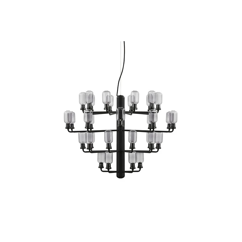 The Amp Chandelier Smoke/Black was designed with the tube amplifier from old radios in mind. The shape from the pendant and table lamp in the same collection has been carried over to this showstopper of a chandelier. It’s built up around a column with small arms that each hold a miniature version of the table lamp.
