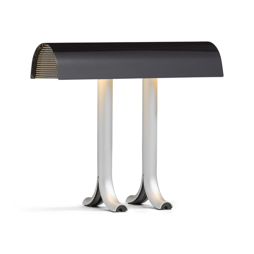 The Anagram Table Lamp Iron Black is a whimsical and functional design that adds edge and character to any interior. Anagram combines a strong personality with a robust construction, inspired by the shapes of the Barbican centre in London. The designer was also inspired by the idea of creating a nostalgic yet functional lamp, where the juxtaposition of perforated and non-perforated steel led him to explore different plays of light. The result was this unique table lamp, which consists of a curved, glazed lampshade resting on two anodised aluminium legs. The lampshade is available in several different colours, each of which contributes positively to the overall aesthetic of the lamp. The table lamp has a downward, ambient light that works particularly well on a desk, windowsill or side table, where it serves as both a practical and decorative decor element.