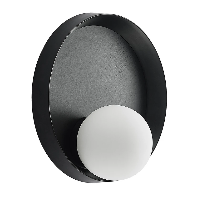 Andelina Wall light Black/Opal is a visually appealing lamp in terms of both form and function. The lamp has a fascinating design with a circular wall bracket and a spherical light element off-centre that interact harmoniously.