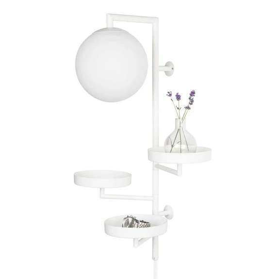 Astoria Wall Light White is a simple and elegant design that can be used in more than just one way. The Astoria design comes as both a floor lamp and a wall lamp, which you can get in different beautiful colours, so you can get the right model for your style and needs. In addition to a spherical lampshade in opal glass, the lamp also consists of a slender frame that supports three round shelves of 15 cm in the wall lamp and 18 cm in the floor lamp, so you can have both plants, books, remote controls, keys and knick-knacks, making the lamp just as functional as decorative in the interior design. You can therefore advantageously place this lamp close to the sofa group, next to the bed, at the desk or in the hallway, so you always have a good light and the necessary things close to you. This stylish and functional design was also the winner of the Hus & Hem design competition in 2016.