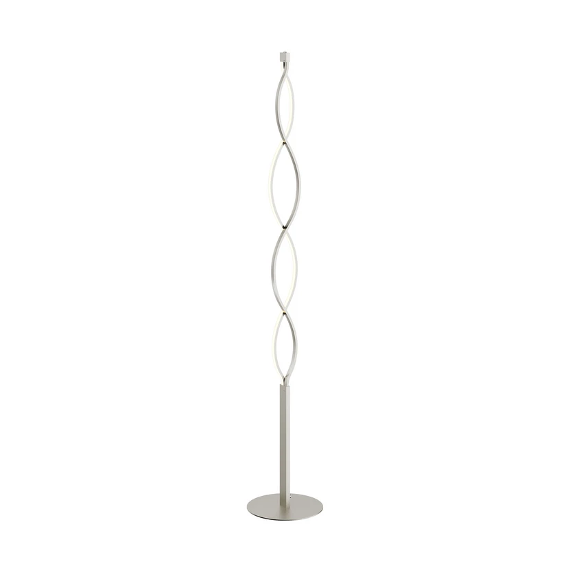The lamp's two wave elements twist around each other in an almost DNA-like structure. One strand is a metal element with a satin nickel finish that matches the rest of the lamp, while the other strand is the light element. The LED light source runs in a band from top to bottom, so the light also takes on a wave-like shape when the lamp is switched on.
