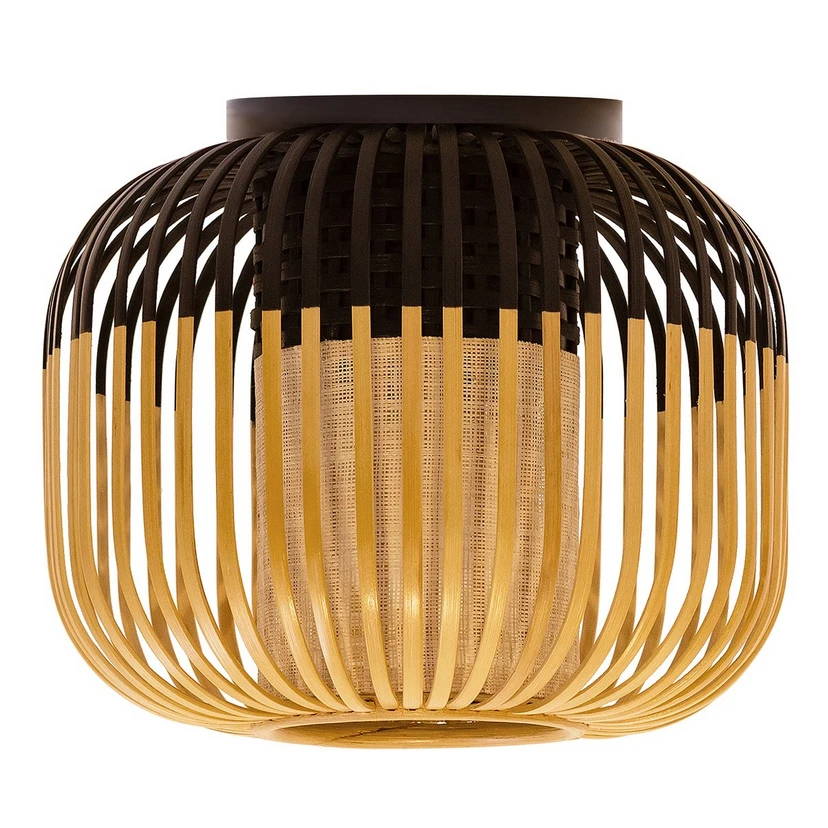 The design is characterised by the two-tone lampshade and symmetrical bamboo strips that allow you to see through to the cylindrical diffuser of woven and pleated bamboo.