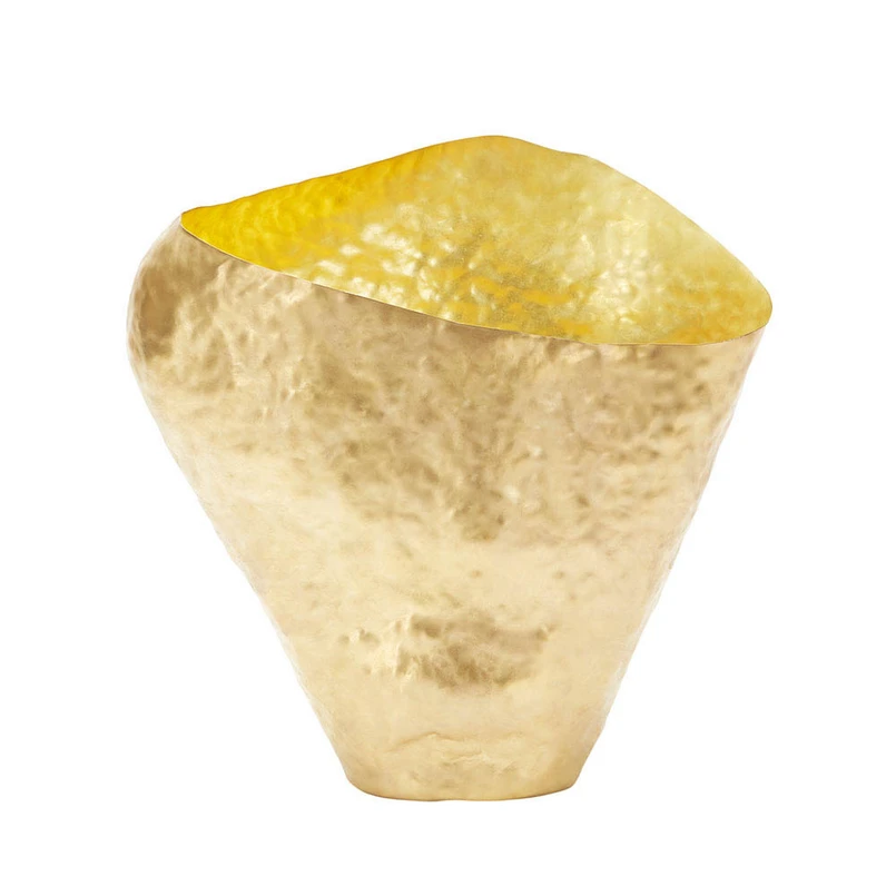 The Bash Vessel Bowl Wide Gold - Tom Dixon is a unique piece of homeware from the renowned brand Tom Dixon. This bowl is created from a single brass plate that is carefully hammered by hand to achieve an expressive and curvilinear shape that makes each bowl unique. With its brass colour, it adds a touch of elegance and modern art to your home. The generous dimensions of 23.0 cm in length, 38.0 cm in width and 41.0 cm in height make it both decorative and functional. The Bash Vessel can be used as a stylish flower pot, a fruit bowl or as a modern sculpture that catches the eye in any room. However you choose to use it, this Tom Dixon bowl will add a sophisticated touch to your decor.