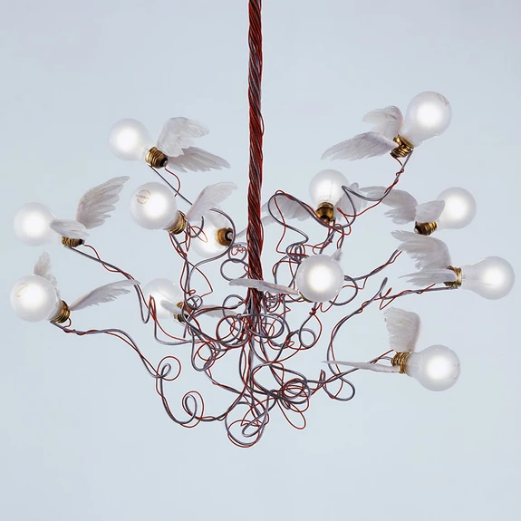 Birdie LED Pendant Red is an exciting lamp from German Ingo Maurer. The iconic wings placed on each socket are made from goose feather and create the impression that the bulbs are about to fly away. This is a lamp with a dynamic and sculptural design, guaranteed to command attention. Birdie is dimmable, so if you want the option to change the brightness, you can attach an external dimmer.