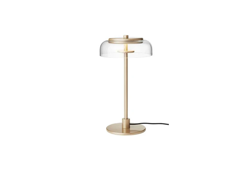 Blossi Table Lamp Small Nordic Gold/Clear is Blossi's take on a beautiful and simple table lamp, available in black or brass with an Clear glass shade. Through the Clear glass, a diffused light shines out into the surroundings, while the opening at the bottom of the shade allows direct downward light. Perfect as a mood light on the dresser in the living room or as a stylish task or reading light at your desk.
