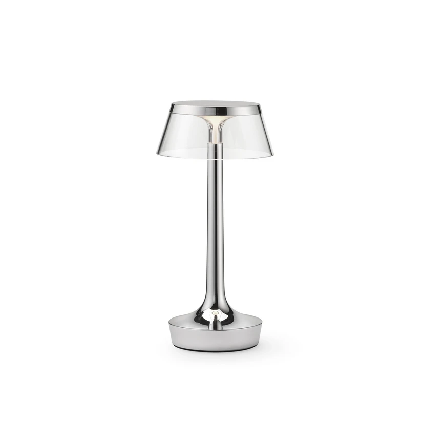 Bon Jour Unplugged Table Lamp Chrome - Flos is the perfect combination of elegance and functionality. This table lamp from the renowned brand Flos is designed to provide direct light without the need for wires, making it ideal for flexible placement in your home. With a height of 27 cm and a diameter of 11 cm, it fits perfectly on any table or bedside table. The body of the lamp is made of durable aluminium and plastic, while the clear, chrome-coloured finish adds a modern touch to your decor.
