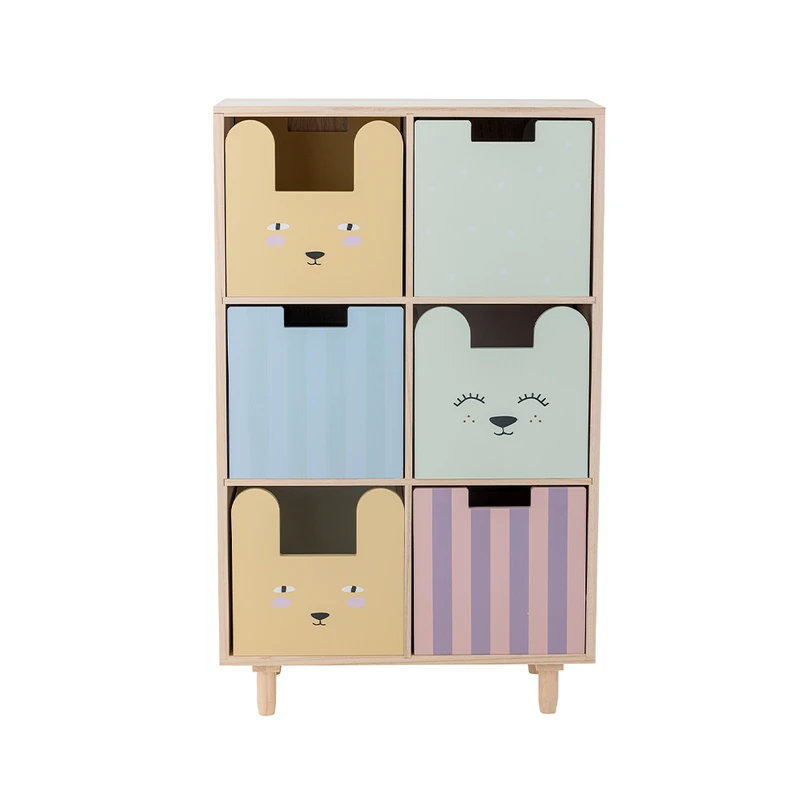 The Calle Bookcase w/drawers Natur from Bloomingville is the perfect solution for creating cosy and functional storage in the children's room. This charming bookcase combines practical shelves and spacious drawers, making it ideal for organising books, toys and other small items. Made from natural Paulownia wood, MDF, plywood and iron, the bookcase exudes a warm and inviting atmosphere that fits perfectly into any home. The natural colour makes it easy to integrate the shelf into different interior styles. One of the great advantages of the Calle Shelf is its flexible design that allows you to place it both horizontally and vertically, so it can be customised to your specific needs and room layout. Remember that the rack must be assembled by an adult before use and can support up to 5kg in each drawer and 3kg on each shelf..