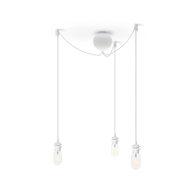 Choose between 3 different solutions for one, two or three lights. It is available in both black and white and comes with 2.5 metres of fabric cord in a matching colour and an E27 socket that fits the number of lights that can be connected., whether you need one pendant light in the bedroom, two above the dining table or a group of three pendant lights in a dark corner of the house.