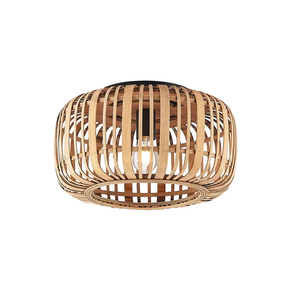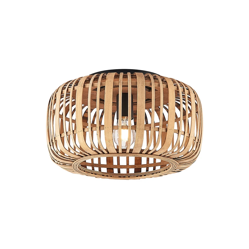The Canyana Ceiling Lamp Nature brings a piece of nature into every room and can be integrated into many facilities. The lamp follows the popular cage lamp trend but has replaced the industrial metal strips with wide, light-coloured rattan rods, creating a globe-shaped construction that frames the light source inside.