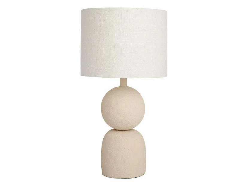 This table lamp is a tribute to the graphic meeting of imperfection and refinement, combining natural forms with elegant linen. Cia is more than just a table lamp - it's a work of art. Each Cia lamp is handmade and has a metal base that is lovingly covered with sustainable papier-mâché, making each table lamp completely unique. The slight irregularities and textures of the papier-mâché add an authentic and natural charm to the table lamp design. The soft beige base is finished with a beautiful matte finish that adds a subtle luxury and elegance to your space. Together with the white linen cylinder shade, Cia creates a perfect balance of warmth and lightness that will illuminate any corner with a gentle and inviting glow.