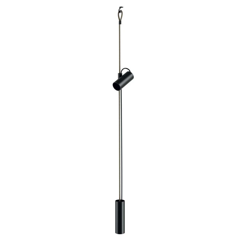 Cima Pendant/Floor Lamp Matt Black/Gold has a truly unique and creative design inspired by the lifting mechanism on a boat, which the Italians call Cima. The lamp can be attached at any point on the rope that stretches from floor to ceiling, and its head can be tilted up and down.