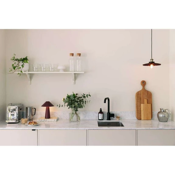 The Cobbler 25 Pendant Light Burgundy from Globen Lighting is an elegant pendant light that brings a modern interpretation of the classic cobbler lamp into your home. This beautiful lamp is designed to fit perfectly into different interior styles, whether it's a modern country house, a turn-of-the-century home or a French bistro. The lampshade of the lamp is made of pleated glass, which creates a mesmerising light diffusion that adds a warm and inviting atmosphere to any room. The dark red shades are combined with details in matte black and antique brass-coloured metal for a sophisticated look. With a 120 cm long black textile cable and a black plastic ceiling cup, installation is both simple and stylish. Please note that lamp plugs for ceiling connection are sold separately. This pendant light is ideal for creating a central focal point in your interior, whether it's above the dining table or in the living room.