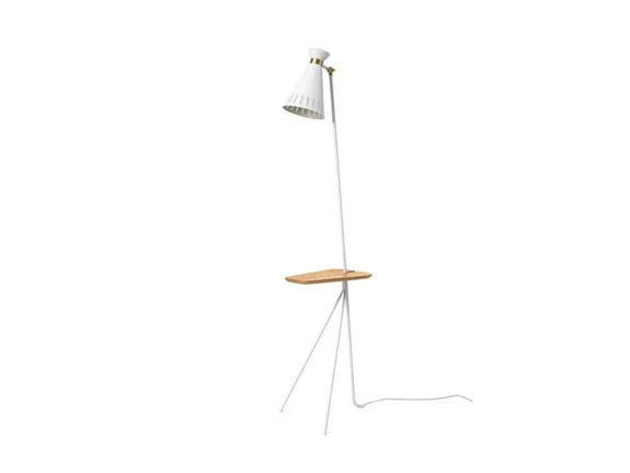 Cone Floor Lamp w/Table Clear White/Oak is a beautiful and design-oriented lighting collection with a history dating back to 1954, when internationally recognised lighting designer Svend Aage Holm-Sørensen designed the lamp and created a classic. The lamp series is characterised by a cone-shaped lampshade, which has given rise to the series' name. The lampshade is made of metal with an exclusive silky matt colour that is a hallmark of Warm Nordic and a characteristic ring of solid brass that gives the impression of holding the lampshade together and adds a beautiful classic touch to the overall whole. The edge of the shade has light holes that contribute beautifully to the overall lighting effect.