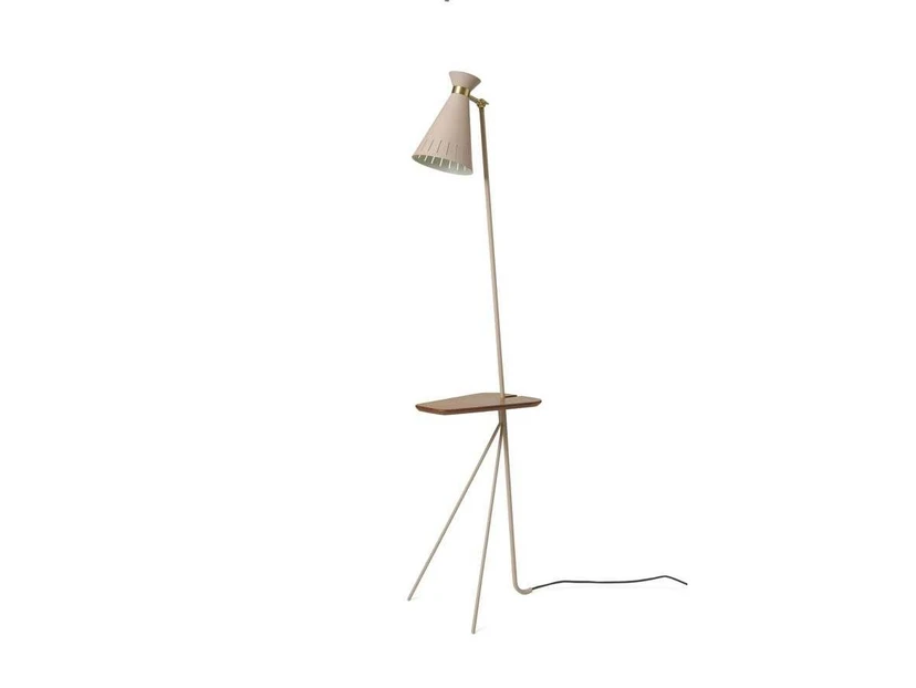 Cone Floor Lamp w/Table Pure Cashmere /Teak is a beautiful and design-oriented lamp series with a history dating back to 1954, when the internationally recognised lighting designer Svend Aage Holm-Sørensen designed the lamp and created a classic. The lamp series is characterised by a cone-shaped lampshade, which has given rise to the series' name. The lampshade is made of metal with an exclusive silky matt colour that is a hallmark of Warm Nordic and a characteristic ring of solid brass that gives the impression of holding the lampshade together and adds a beautiful classic touch to the overall whole. The edge of the shade has light holes that contribute beautifully to the overall lighting effect.