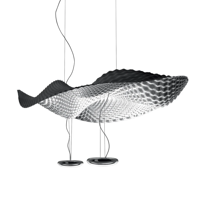 Cosmic Angel S LED Pendant Polished Chrome by Artemide is a remarkable pendant light that brings a sense of weightless elegance into your home. This pendant light was created with a vision to capture a moment where the movement of air forms a thin surface, resulting in a natural flow and rhythm in its light, sculptural form. It appears to float in space as if supported by a cushion of air, recalling the cosmos with its complex shapes and geometries that create a sense of infinity. The body of the lamp is made of thermoplastic material, while the cast aluminium units and the upper diffuser in opal methacrylate ensure even and pleasant lighting. This chrome-coloured pendant light is ideal for adding a modern and sophisticated touch to any room where you want to create a unique atmosphere..