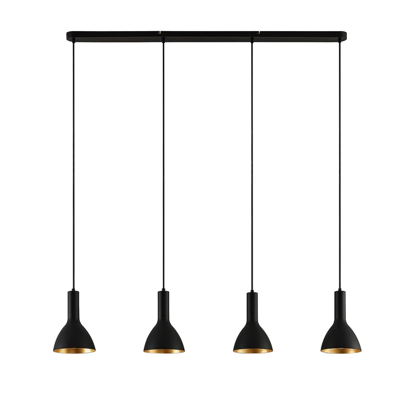 Cosmina 4 Pendant Track Black/Gold creates a lush contrast between the matte black surface and the gorgeous golden inside. The elegant Nordic minimalism meets a variegated glow of warmth and comfort. The light is channelled downwards by four lampshades, giving rise to a nice and clear light that doesn’t blind.