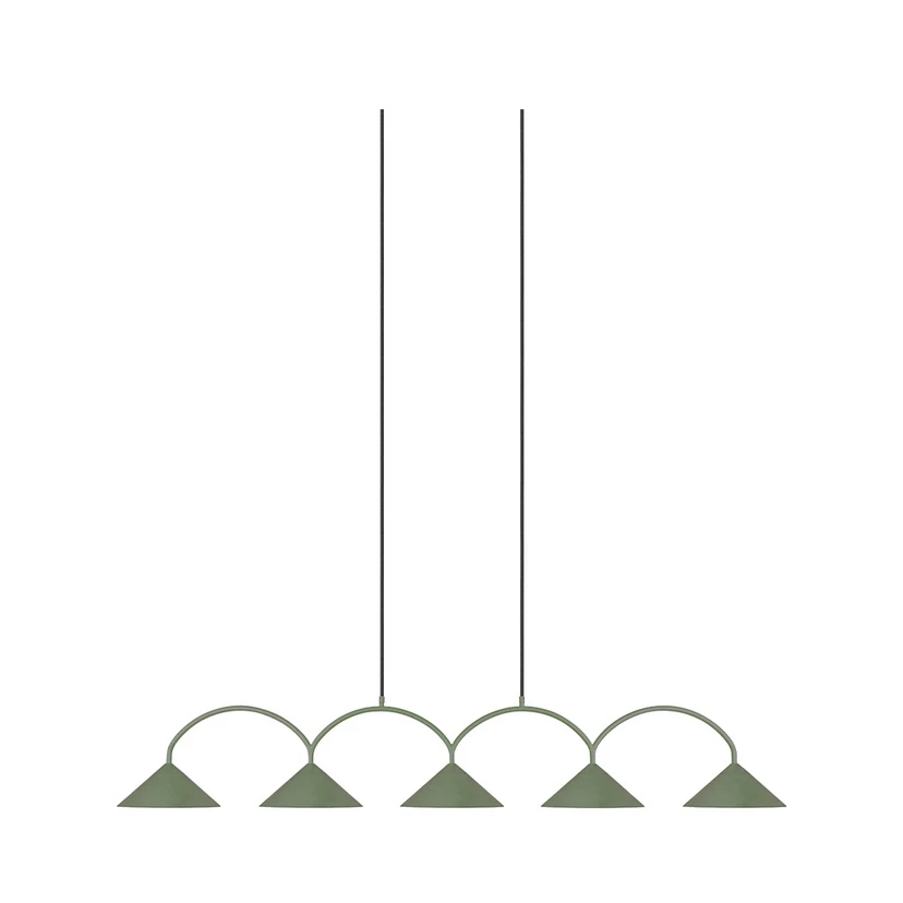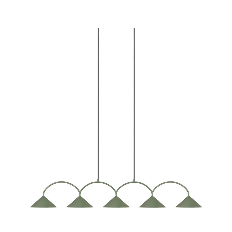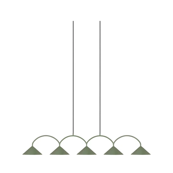 Curve 5 Pendant Light Green from Globen Lighting is an elegant pendant light that combines geometric shapes in a unique way. The soft, curved lines meet the sharp, triangular lampshades, creating a modern and stylish expression. This pendant light is ideal for hanging over the dining table or kitchen island where it will add a sophisticated touch to the room. The lamp is made of matt lacquered metal in a beautiful green colour that adds a touch of colour to your decor. With five metal shades and two black textile cables of 200 cm each, Curve 5 is both functional and aesthetically pleasing. The included metal ceiling cup ensures easy and elegant installation. Please note that lamp sockets for ceiling connection are sold separately. Make your home more inviting with this stylish lighting solution that combines design and functionality in the best possible way..