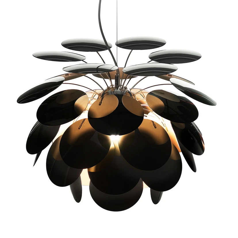 The Discoco pendant is made from 35 circular discs made from ABS. It has a lacquer finish and is available in a selection of colours.