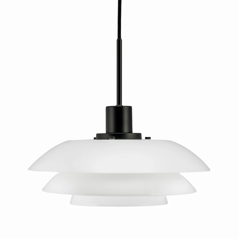 DL31 Pendant Opal/Black has a diameter of 31cm and therefore works well over kitchen and dining tables where the family comes together. The sophisticated look is supported by a black fabric cable, which stands in soft contrast to the lampshade.