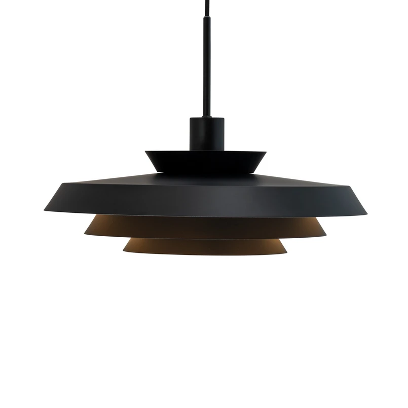 DL44 Pendant Light Black is characterised by a classic, timeless look that ensures an eternally stylish design. The lamp's three-part lampshade is familiar from many other designs, as the three-part design not only creates a harmonious overall look but also directs the light effectively downwards in a practical downlight. This model has an angular silhouette that gives its design a beautiful geometric orientation and a modern twist that blends beautifully with the classic undertones. The white inner surface reflects the light, creating a clear light image when switched on.