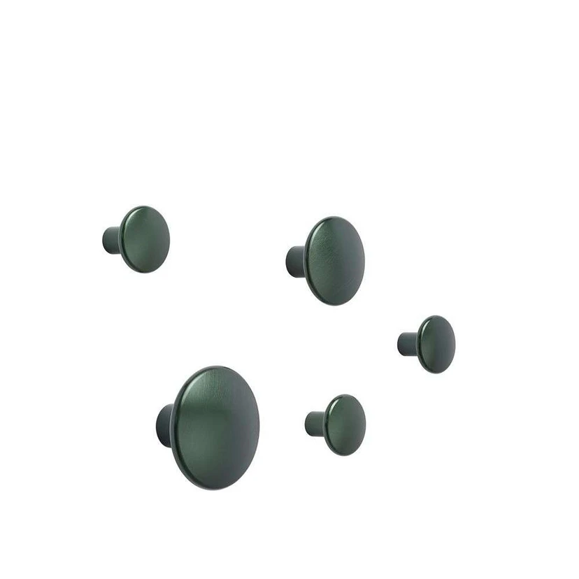 Dots Metal Set Of 5 Dark Green is a playful take on the classic hook. This product comes in a set of five, allowing you to create a unique expression. Use Dots in the hallway, bedroom, or bathroom – or wherever else you need hooks.
