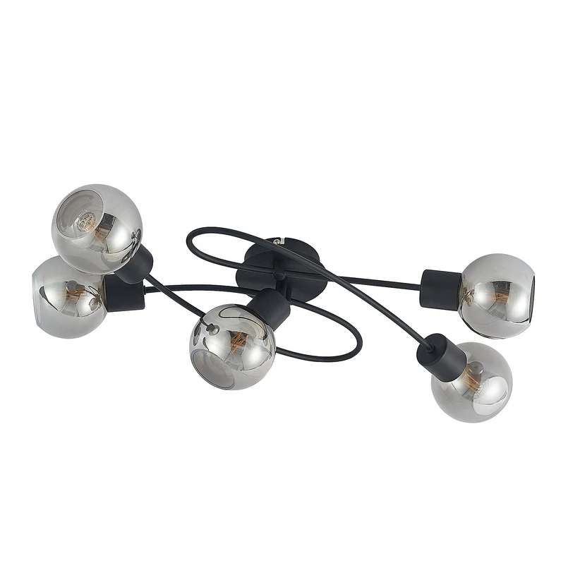 Elaina 5 Ceiling light Black/Smoke is a beautiful series of lights with a coherent expression. All lamps have the same modern appearance and the same simple combination of metal frames and round glass shades. The lampshades have a light outlet at the bottom for direct lighting. As they are also made of glass, the light also penetrates the lampshade itself, which is illuminated all the way round. The matt white surface of the glass enables efficient light emission but with a soft and glare-free glow.