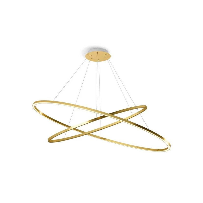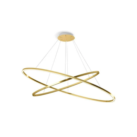 The Ellisse Double Pendant Painted Gold is a mesmerising light object with its beautiful circular structure that evokes a planetary journey towards Saturn's rings. The pendant lamp is ideal as a living or dining room lamp - preferably in the centre of the room where the beautiful design can be admired from all sides - but can easily find a place in other rooms in need of tasteful and atmospheric lighting.