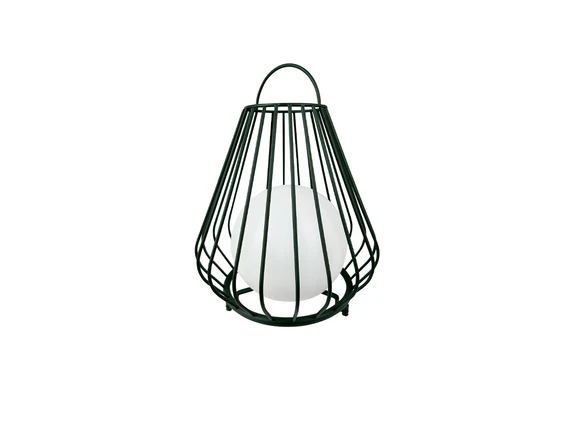 The Evesham Outdoor Lantern Medium Green impresses with its durable design, multiple setting options, high functionality, appealing appearance and decorative lighting. A particular highlight of this model is its cordless design, which allows you to transport it and enjoy its light wherever you are. For this purpose, the frame is equipped with a handle at the top, making it easy to take with you. The frame forms a beautiful cage structure around the white, round lampshade. Behind the lampshade, the lamp has a built-in LED light source that emits a soft illumination in a warm white colour tone. The brightness can be adjusted in three levels, so you always have the right type of light at your fingertips. The lamp is powered by a battery that is charged via a solar panel. However, the lamp also has a USB port (corresponding USB cable included in the delivery) to charge the lamp on cloudy days.