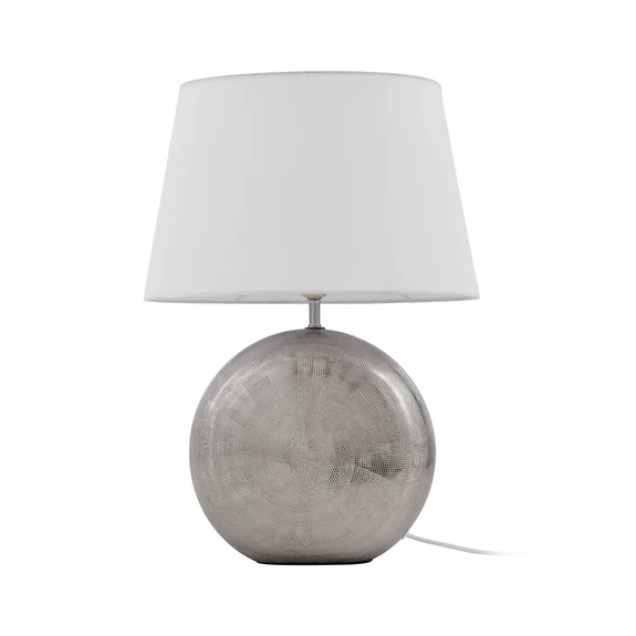 Florentino Table Lamp Silver/White is the perfect accent light for anyone with a penchant for artful decor. The lampshade has a classic round shape that tapers slightly at the top and is open at each end, allowing the light to flow out in a beautiful two-part illumination. At the same time, the light penetrates through the fabric, whose white, matt surface ensures an effective but soft and pleasant glow. However, the base of the lamp catches the eye with its shape, colour and beautiful surface pattern. The base is made of ceramic and has a soft, sculpted shape and an appealing silver finish that gives it a metallic look. The surface has a lifelike, rivet-like pattern that winds in a slight spiral, emphasising the fascinating metallic look. When switched on, the light reflects off the surface to shine in beautiful light accents that beautifully complement the primary lighting from the lampshade.