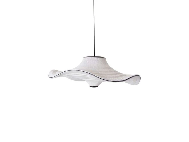 The pendant light is equipped with an LED light source built into the top of the lamp. From here, the light spreads softly through the knitted part of the lamp. The underside is knitted in a white fabric so that the light can effectively penetrate the lampshade, resulting in a diffuse and pleasant light pattern. For this reason, the pendant light is ideal for the coffee table or other places where soft and indirect lighting is desired.