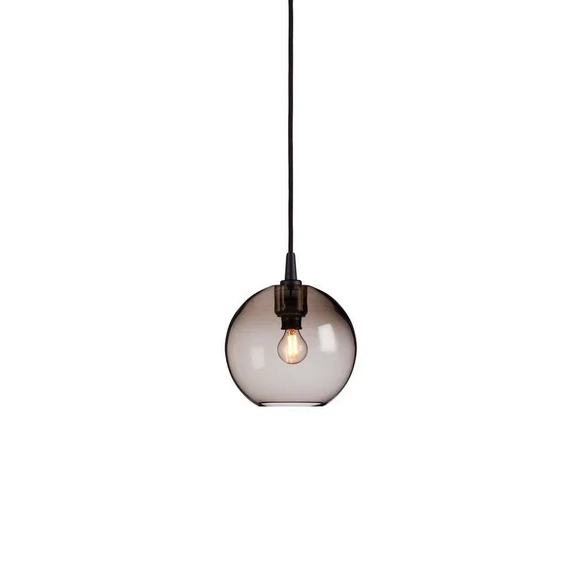 Gloria Pendant Ø190 Black/Smoky Glasss from the talented Swedish designs at Belid is an elegant and exciting pendant that combines various expressions. The lamp—that might be confused with a chandelier at first sight—has an industrial touch that brings to mind 19th-century England. But it also has an unmistakeable modern touch, and the dark glass spheres and naked bulb give the lamp a contemporary look.