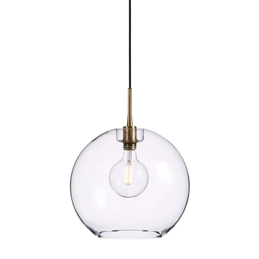 Gloria Pendant Ø380 Brass/Clear Glasss from the talented Swedish designs at Belid is an elegant and exciting pendant that combines various expressions. The lamp—that might be confused with a chandelier at first sight—has an industrial touch that brings to mind 19th-century England. But it also has an unmistakeable modern touch, and the dark glass spheres and naked bulb give the lamp a contemporary look.