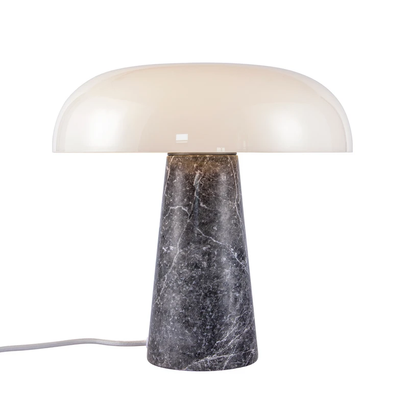 The sophisticated and elegant design features a base in exclusive marble, a lampshade in opalised glass, and a top button in brushed steel. The lamp provides a soft and cosy light that is sure to spread and create warmth and atmosphere in your home.