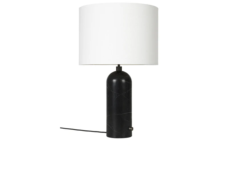 Gravity Black Marble/White was designed with the contrast between the heavy cylindrical base and the light fabric lampshade in mind. The combination of the two lends a perfect balance to the design—hence the name Gravity. When the lamp is on, it emits a diffuse and atmospheric glow that contributes to the cosy atmosphere.