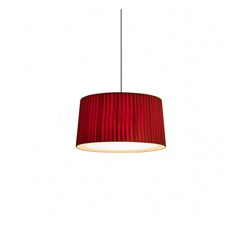 GT pendant Red-Amber Ribbon is a unique lampshade of handmade cotton tape with a classic yet dramatic design. When the lamp is on, it distributes a cosy warm glow while the unlit lamp adds a sculptural element to your décor. The base of the lampshade is fitted with a glass sheet that hides the light source and ensures an even light that does not blind. Place it above your dining table to light up the heart of the home and light up the room in a diffuse glow.