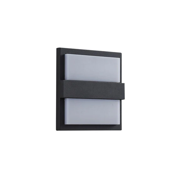 Gylfi LED Outdoor Wall Light Graphite is a practical outdoor model with a beautiful minimalist design that easily fits on facades and exterior walls. The lamp design attracts attention with its clean, straight lines and modern appearance: a square aluminium plate frames the opal white diffuser that emits the light. The frame has a crossbar mounted to divide the diffuser into two rectangles.