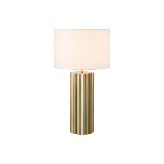 The Hashira table lamp in antique brass/off-white captivates with its solid and sculptural appearance. The lamp is named after the Japanese word for pillar, and it is precisely the shape and structure of the pillar that inspired the design of this lamp model. The base is made of metal and is available in two versions: matt black and antique brass. Both versions feature the same ribbed surface, reminiscent of the ribbing on a classic column, giving the overall design a solid and majestic appearance. The crowning glory is the upper lampshade, which emits light in all directions. The lampshade is made of off-white fabric, which creates a stylish look while allowing the light to penetrate the environment efficiently but softly and without glare. This creates a pleasant light pattern that wonderfully complements the main lighting in the room and can be integrated into almost any space.