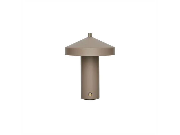 The Hatto Portable Table Lamp Clay adds a unique ambience to the room through its shape-orientated and artistic design. At the same time, you can enjoy the lamp's cosy lighting and high functionality that offers great and practical customisation options. The compact base and wide, hat-shaped lampshade combined with the shiny, earth-coloured surface make the Hatto Table Lamp look like a forest mushroom. This gives the lamp an organic feel and adds a natural expression to the otherwise clean, linear design. The fine brass details refine the aesthetic value of the lamp. This model is cordless and can therefore be easily transported to the room that needs light. The LED light source has multiple settings, so you can choose between three different brightness levels.