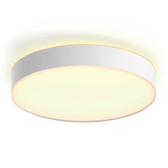 The Hue Enrave L Ceiling Light White Ambiance by Philips Hue is the ideal solution for illuminating larger spaces like your living room. This elegant ceiling light combines functionality and style with its modern design in white metal and plastic. With a height of 8.4 cm and a diameter of 42.5 cm, it fits perfectly in any home. The lamp creates a subtle ring of light that casts a soft glow up towards the ceiling, while the bright downward light fills the room with a cosy atmosphere. You can easily adjust the light from warm to cool white to suit any mood or activity. Philips Hue's advanced technology allows you to customise the lighting according to your needs, making this ceiling light a versatile choice for any room. Make your home more inviting with this stylish and functional lamp that combines the best of modern design and advanced lighting technology..