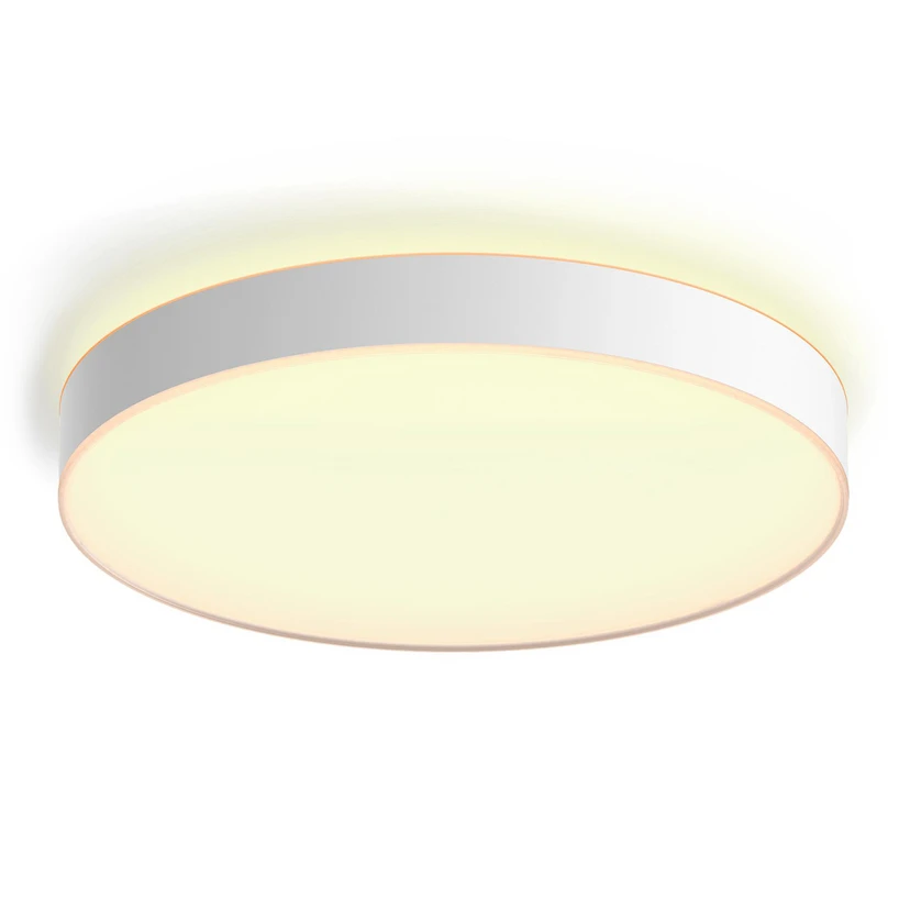 Hue Enrave XL Ceiling Light White Amb. White from Philips Hue is the ideal solution for illuminating larger spaces like your living room. This elegant ceiling light combines functionality and style with its modern design in white metal and plastic. With a height of 8.4 cm and a diameter of 55 cm, it fits perfectly into any home where you want to create a cosy atmosphere. Enrave XL casts a subtle ring of light up towards the ceiling while emitting a strong downward light, filling the room with gentle shades of warm to cool white light. This allows you to customise the lighting to suit your needs, whether you want a cosy atmosphere or a more energetic light. Philips Hue's advanced technology ensures that you always have the right lighting for every occasion. Make your home brighter and more inviting with this versatile ceiling light..