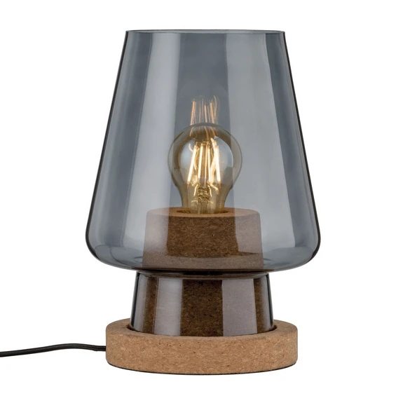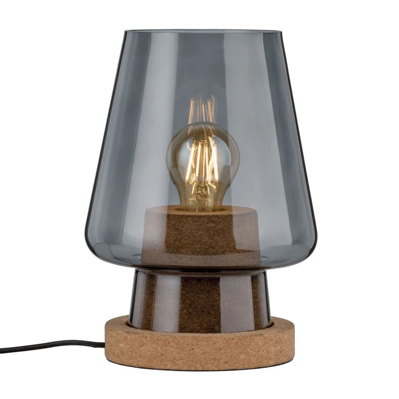 The Iben Smoke/Cork table lamp is ideal as a decorative accent light on your desk, windowsill or chest of drawers. The cosy design is relatively compact with a beautiful smoke grey glass shade in the shape of a drinking glass and a circular cork base that adds a natural and warm yet light expression to the overall design of the lamp. The smoky grey surface of the glass provides a direct view of the light source inside. As the light source is therefore part of the visual expression of the lamp, you can choose a decorative bulb model that matches the decorative lamp design, such as a filament or retrofit light bulb.