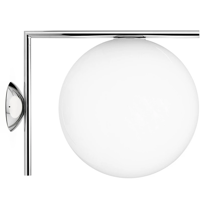 IC C/W2 Wall Lamp/Ceiling Lamp Chrome walks the line between simplicity and elegance whilst juggling form and functionality. The centre of the lamp is a perfectly rounded glass ball, balanced on a slender, black stand, creating a proud expression and an amazing contrast.