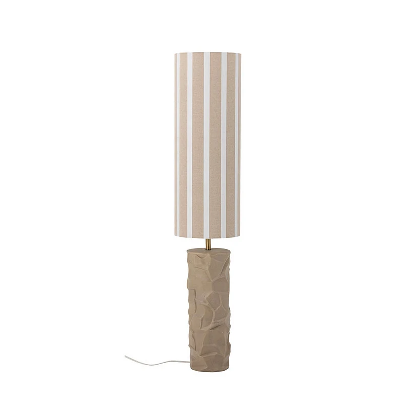 The lamp is made of metal, fabric and stoneware, ensuring a robust and durable construction. The organic texture of the lamp's base gives a natural look, while the neutral colours of beige and white create a calm and earthy atmosphere. The simple lampshade is decorated with vertical stripes that create a beautiful contrast to the natural look of the base.