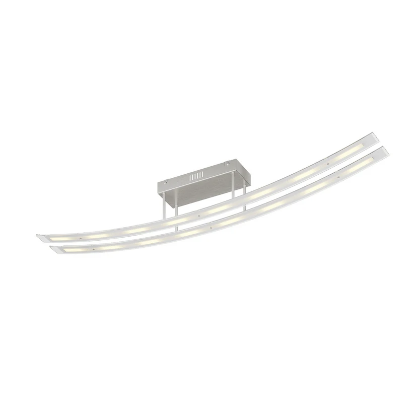 The lamp is composed of a rectangular ceiling bracket and two slim, elongated lamp heads that run parallel to each other in an elegant curve. The lamp heads have a matt nickel finish, which is complemented by a domed glass plate on the underside. Behind this are 16 LED modules that shine in an energy-efficient warm white light, reaching all corners of the room.